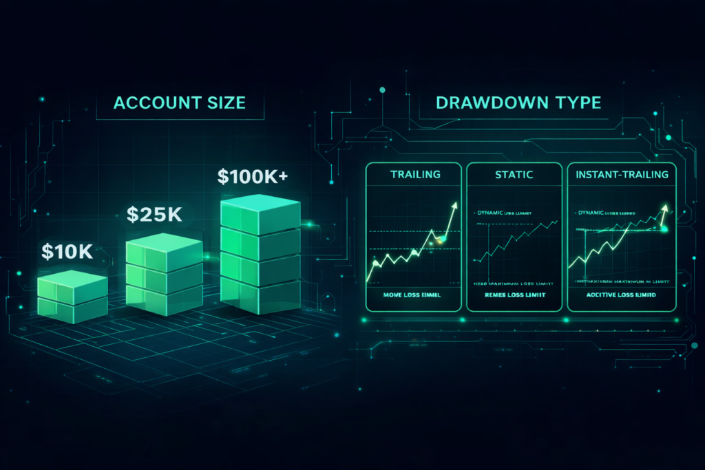 Account size determines your profit potential, while drawdown type affects how you manage risk during the evaluation.